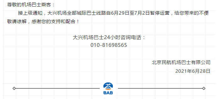 据北京民航机场巴士有限公司微信公众号6月28日消息,接上级通知,大兴机场、首都机场全部城际巴士线路自6月29日至7月2日暂停运营。