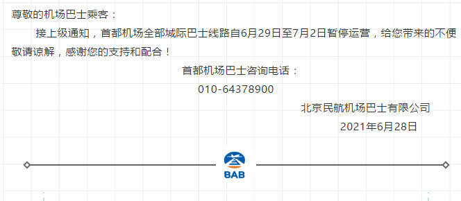据北京民航机场巴士有限公司微信公众号6月28日消息,接上级通