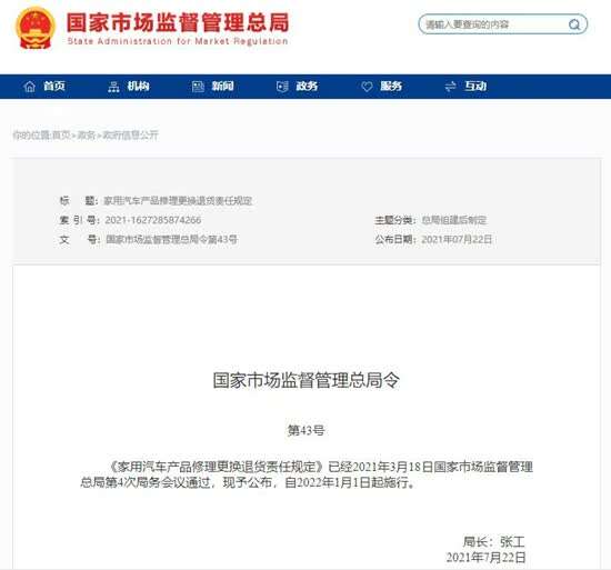 此《规定》已经2021年3月18日国家市场监督管理总局第4次局务会议通过,自2022年1月1日起施行。2012年12月29日原国家质量监督检验检疫总局令第150号公布的《家用汽车产品修理、更换、退货责任规定》同时废止。