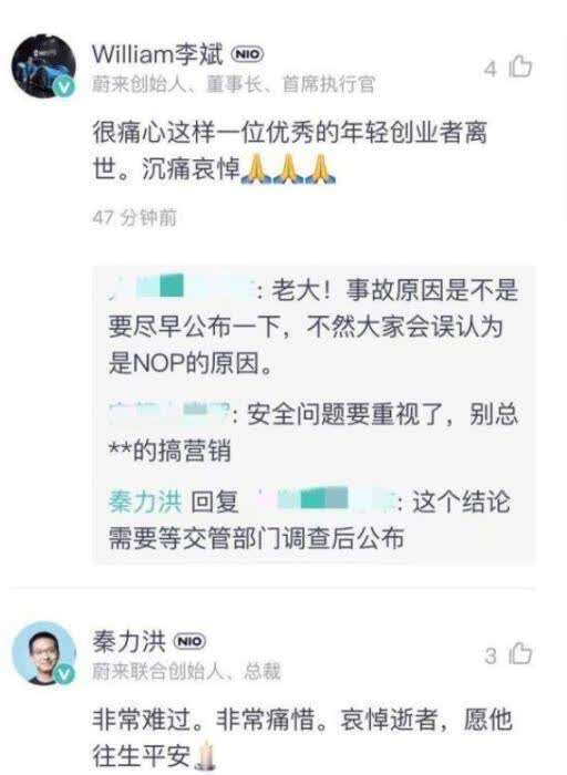 在该文章下方,蔚来创始人、董事长、首席执行官李斌表示,很痛心这样一位优秀的年轻创业者离世。蔚来联合创始人兼总裁秦力洪也留言悼念。