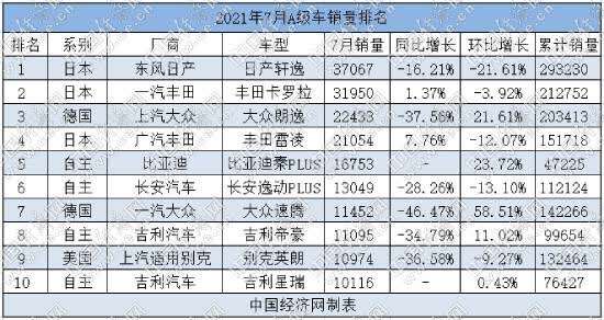 7月A级车:合资车企缺芯片明显 自主趁势而上