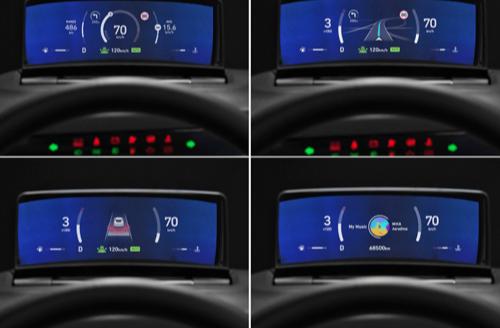 该显示器由上部三个和下部一个,共四个显示区域构成。上部显示速度、转速、ADAS和导航等相关信息;下部显示换挡模式、冷却液温度和行驶里程等车辆基本信息,并且转向灯、系统信息警告灯的功能也在下方区域显示。驾驶员不用低头,也不用扭头,就能看到行驶信息,这对提高行车的安全性有很大帮助。