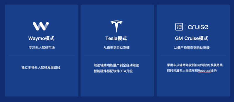 智能驾驶行业发展至今,被行业公认有商业价值的发展模式大致分为三类,即Waymo 模式、Tesla模式与GM Cruise模式。