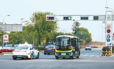 无人驾驶公交(右)行驶在苏州高铁新城。商 震摄(人民图片)