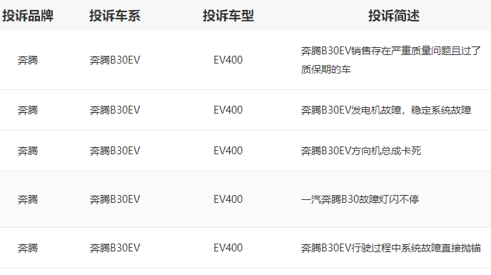 记者在梳理中国网汽车质量投诉平台上数据后发现,奔腾B30 EV出现了多起电机故障、系统故障,无法正常使用车辆的情况,也引发车主们的强烈投诉。