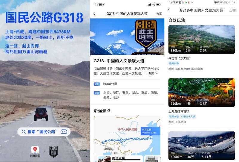 同时,百度地图还上线了G318公路的专属自驾游路线,公路总里程覆盖5476公里,打开百度地图搜索“国民公路”, 即可查看属于你的“此生必驾318”,这一路蜿蜒而上,勇闯天涯,阅尽祖国万里山河画卷,选择你要去的目的地,出发吧,奔赴下一片山海!