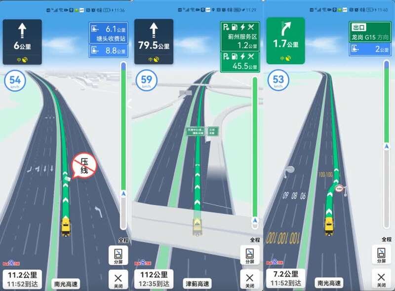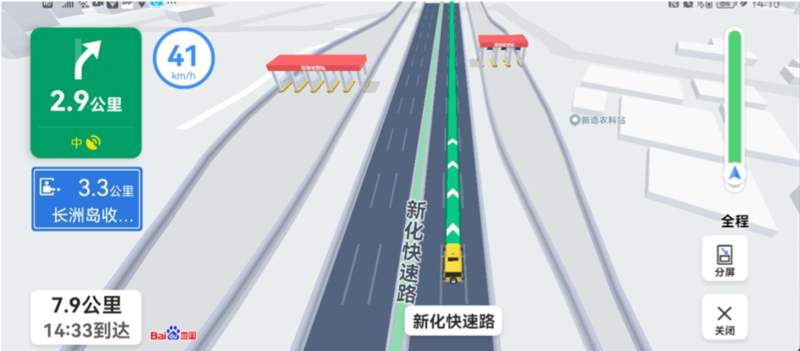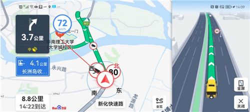本次升级,百度地图车道级导航服务的稳定性取得了突破性提升,可在支持高精度数据的城市,实现全程车道级导航效果触发,为用户持续提供更精准的车道导航。同时,新版车道级导航采用分/全屏动态导航框架,支持根据不同诱导场景,自动切换至最优显示形态。例如,在高、快速路口会采用视野范围更广、要素呈现更丰富的全屏形态,非路口则自动切换为分屏形态,侧重路线信息展示,用户还可以根据个人需求一键切换。