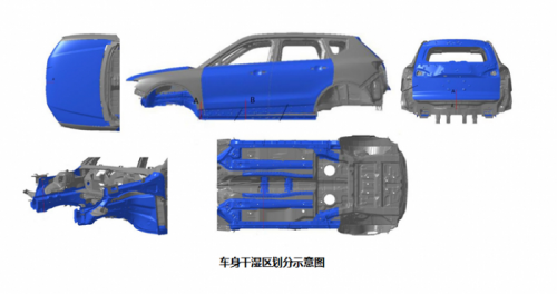 坦克平台拥有体系化的可靠性能,对车辆设计、验证和使用的全生命周期都进行了强劲保障。首先在设计方面,对车身进行差异化防腐设计,根据发动机罩、侧围/车门/翼子板、后背门、机舱区域、地板下部区域等进行车身干、湿区划分。针对湿区易腐蚀部位通过镀锌板、涂胶、喷防腐蜡等防腐设计,从源头提升可靠性能。
