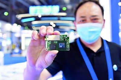 参展商在中国卫星导航成就博览会上展示装有抗干扰芯片的模块。