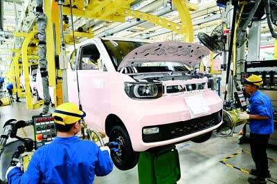在广西柳州一家汽车企业,工人在新能源汽车生产线上忙碌。