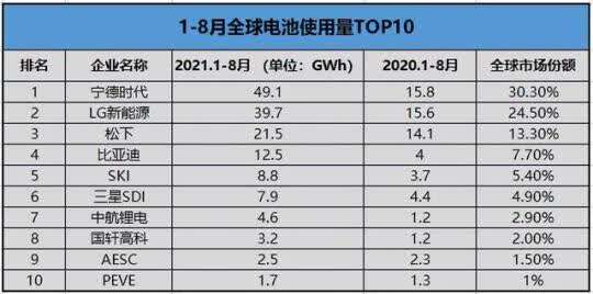 LG电子是全球第二大电池制造商。截至8月底,LG电池全球装机量为39.7GWh,占全球电动汽车电池市场的 21.5%,仅次于中国的宁德时代。近年来,宁德时代与特斯拉、丰田、本田、大众等多家汽车巨头建立战略合作关系,市场份额达到32.5%。