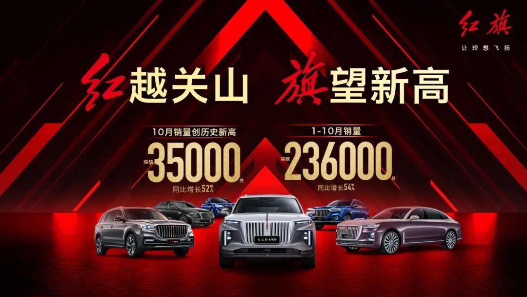 10月31日,新红旗品牌宣布10月销量突破3.5万辆,同比增长了52%,创下品牌单月销量新纪录。今年1-10月,红旗销量突破23.6万辆,同比增长54%。