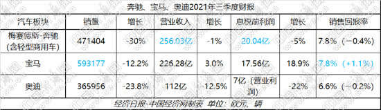 BBA近日发布的财报显示,三季度,三家品牌汽车板块销量均同比两位数下滑。同时,奔驰、奥迪在营收、息税前利润、销售回报率上亦不同程度下跌;而宝马则在该三项财务指标上仍保持增长,创下历史新高。