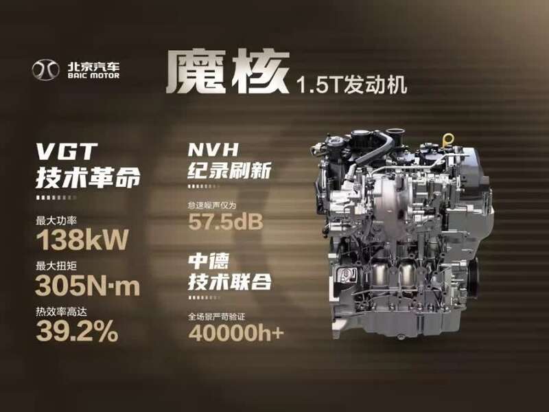 来自于北京汽车魔核动力平台的1.5T发动机,行业首款量产搭载VGT增压器技术,不仅拥有138 kW最大功率、305 N.m最大扭矩,以及高达39.2%的超高热效率的巨大优势;更是同级别产品NVH性能“天花板”,其怠速噪声仅为57.5dB。强大的性能优势,让魔核动力1.5T发动机脱颖而出。