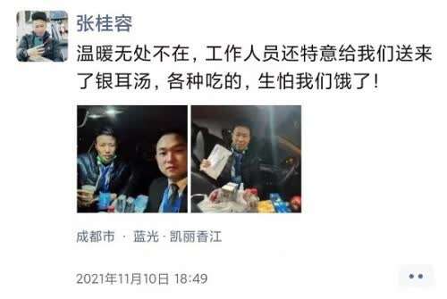 晚7点,奔波了一天的张桂容和胡杰分别躺在车内休息,等待下一个行程。这时,社区工作人员送来了水果点心,并对二人表达了真挚的感谢。而张桂容也在朋友圈记下了一幕,并写道:“温暖无处不在。”