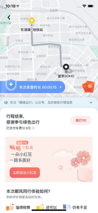 而当满载谢意的小红花成功送达车主后,乘客也将收到来自平台的反馈:“车主要感谢慷慨送花的你,让这次行程更美好了”,从而让更多主动送花的乘客感受到鼓励和温度。