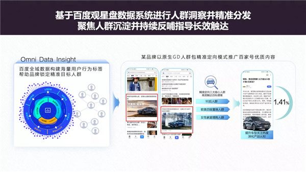 优质内容传播离不开内容分发,精准的信息分发让营销事半功倍。在百度汽车营销通案中,通过百度“内容+流量”双引擎营销生态链,百度使用“观星盘数据系统”构建海量用户行为标签,让营销内容精准定向分发成为可能,通过信息流等场景渠道以内容形式加深用户认知,进而帮助品牌方触达更多用户,满足多维营销诉求。