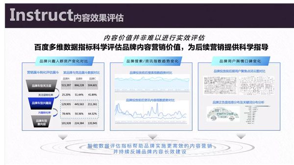 内容传播,必须进行实时的效果跟进与数据复盘。过去,内容的传播价值长期难以精确量化。而在百度汽车营销通案中,依靠百度多维数据指标,品牌方可实时获得品牌兴趣人群资产变化对比、品牌搜索及咨询指数趋势变化对比、品牌舆情口碑变化等量化数据,对内容传播价值进行实效评估,为后续营销提供科学指导。