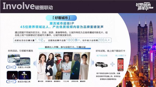 百度的“involve破圈联动”内容打法,可通过百度多元化优质IP、覆盖全品类内容领域,进而满足日趋多元化的用户需求。如可亿级曝光、以线上线下创新联动打造城市大事件为特色“好看城市”超级IP;明星大咖深度参与拍摄,从文化、生活、美食等领域介绍地球景观的“地球漫游计划”等强势IP,都可以联动汽车品牌“破圈”覆盖更多用户群体。
