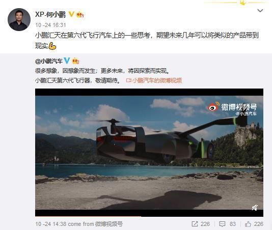 10月24日,小鹏汇天第六代飞行器概念视频发布,小鹏汽车创始人何小鹏对此表示:“期望未来几年可以将类似的产品带到现实”。另据报道称,小鹏汽车计划2024年实现第六代飞行汽车量产,销售价格在100万元人民币以内。
