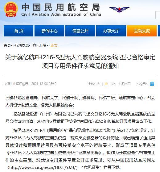 值得一提的,中国民航局网站12月3日消息显示,亿航智能于2020年12月递交EH216-S无人驾驶航空器系统的型号合格审定申请,针对EH216-S无人驾驶航空器系统这一特殊类别航空器的设计特征,中国民航局航空器适航审定司已确定了适用其具体设计和预期用途且具有可接受安全水平的适航要求,形成了项目专用条件《EH216-S无人驾驶航空器系统专用条件征求意见稿》,拟作为开展型号合格审定工作的审定基础。