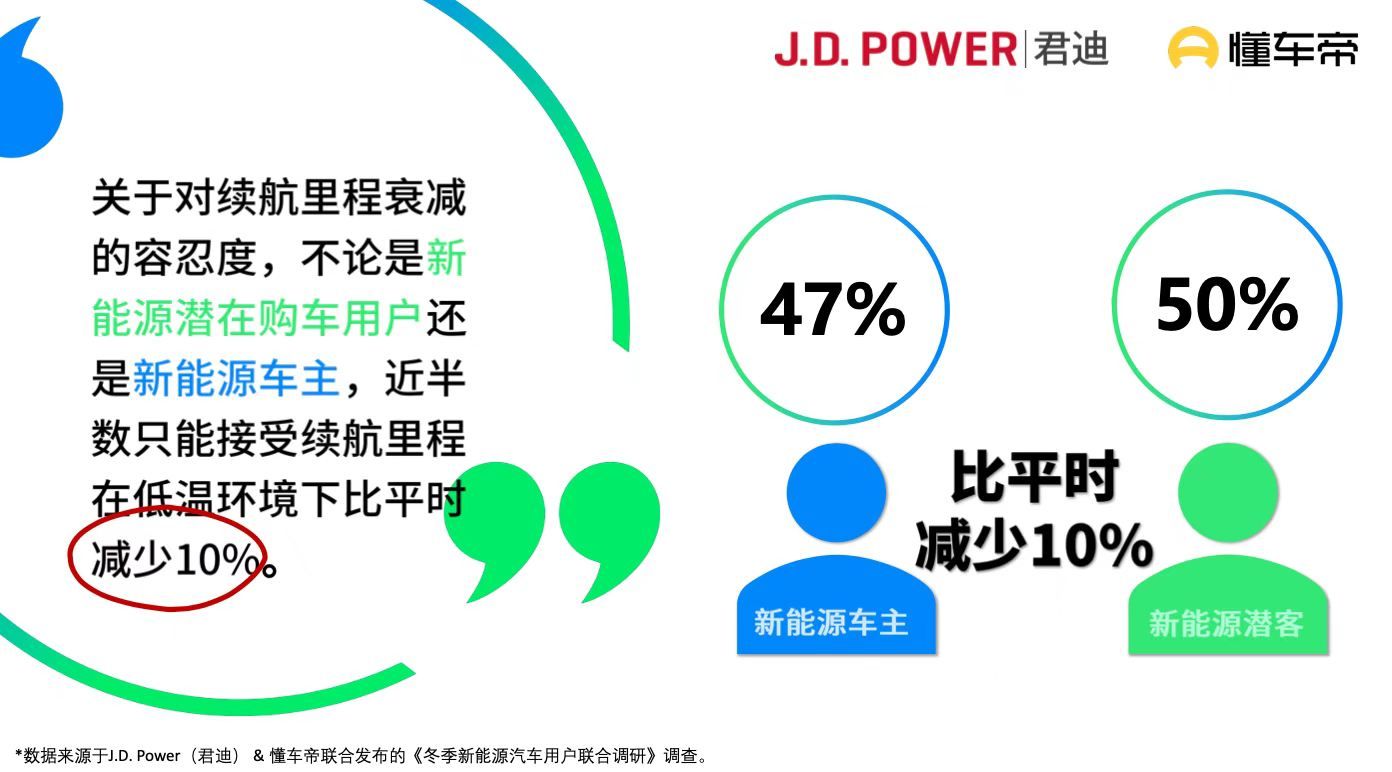 J.D.Power(君迪)中国区汽车数字化用户体验总监裴林表示,不论是新能源车主还是潜在购车人群,对于新能源车的首要顾虑仍集中在续航和充电上,尤其电池不抗冻导致的续航缩水需引起行业警惕。