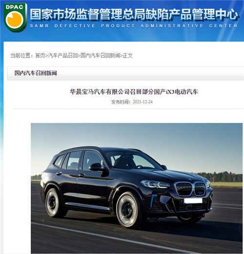 中国经济网12月24日讯 今日,国家市场监督管理总局缺陷产品管理中心发布公告显示,华晨宝马汽车有限公司计划自2021年12月24日起,召回生产日期从2021年4月30日到2021年8月27日的国产iX3电动汽车,共计1974台。