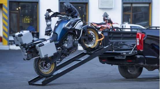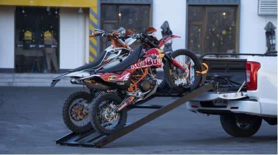 其中,机车架采用高强度绞盘滑轨机构,单人便可以通过遥控绞盘,轻松完成机车的装卸。同时机车架具备机车前轮专用固定装置,搭配尼龙卡扣绑带增强稳定性,无论是高速、多弯的山路,还是越野路况,都可以保证机车的装载稳定性。