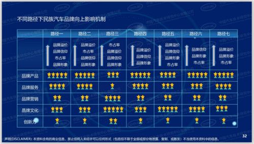 从研究品牌力影响因素入手,“品牌向上路径及机制”在扎实的数据统计和分析的基础上探讨了民族汽车品牌发展特征、多元化向上路径,品牌可根据企业目标和自身资源禀赋选择适宜路径,同时归纳产品、服务、营销、文化、创新五大影响因素,并根据不同路径的阶段目标特点为五大因素赋权,星号越多代表权重越大。研究发现无论哪一条路径,品牌的产品因素都是非常关键的,其次文化因素的影响力也非常大,如何结合中国文化建立自己独特令人共鸣的品牌文化也是民族品牌可以脱颖而出的重要手段。