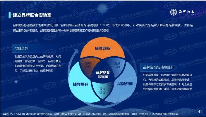 民族汽车品牌向上计划自2021年4月开展以来,共吸引20余品牌加入工作组,并携手长安汽车、岚图汽车、星途汽车、东风风神、东风风行建立起一对一品牌联合实验室,依托“民族汽车品牌向上计划”的研究成果,针对具体企业开展“品牌诊断-品牌咨询-辅导提升”研究,形成研究闭环,针对民族汽车品牌了解自身品牌现状,优化品牌战略和执行策略、品牌策略落地等一些列品牌建设工作提供帮助和指引,为民族汽车品牌建设共研共创提供平台。