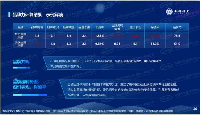“品牌力测量模型”创新性引入用户视角观测品牌,综合用户心智和市场表现定义品牌力,将品牌力分为八个维度,通过问卷和大数据法采集主客观数据,通过熵权法、投影寻踪等方法处理数据,通过品牌力测量模型,可以了解民族汽车品牌状况与动向。知其然,还要知其所以然,项目组以大量详实的数据和生动的案例,系统介绍了民族品牌存在优势,如在当前民族文化的潮流下,相比于技术沉淀深厚、品质可靠的合资品牌,民族汽车品牌更容易引发用户共鸣。