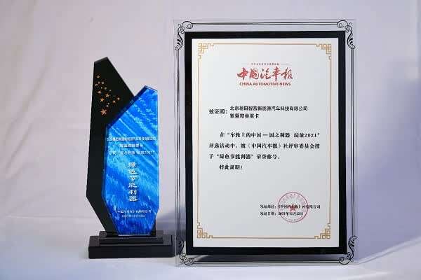 在收获用户口碑的同时,智蓝重卡也获得了来自行业的认可,在中国汽车报主办的“车轮上的中国-国之利器 绽放2021”盛典中,智蓝欧曼重卡荣获“绿色节能利器”奖项。
