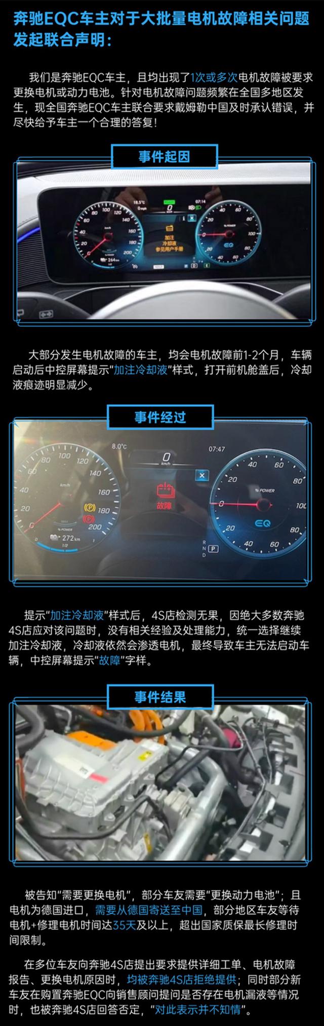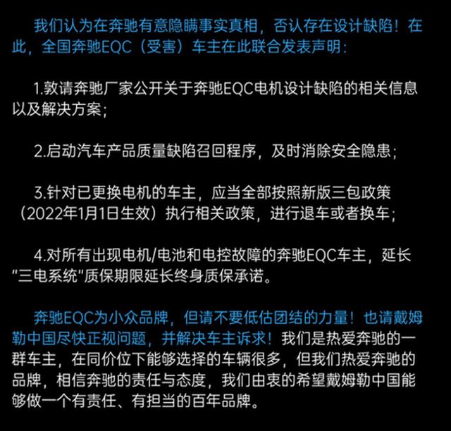 对此,车主们要求奔驰公布EQC电机设计缺陷,并提供召回等解决方案,并延长车辆电机保修。