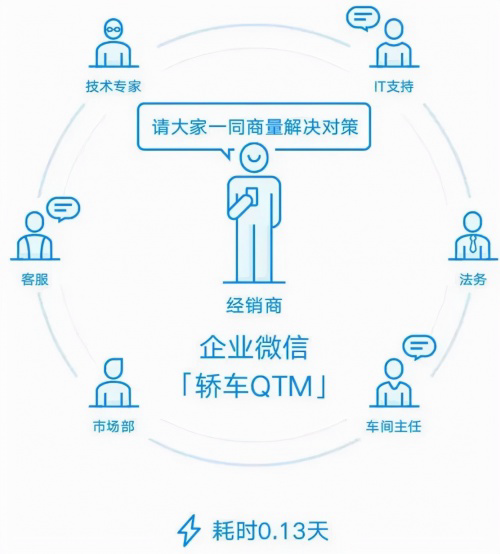 企业微信为长安汽车与经销商建立一套多部门联动并行的沟通方案——轿车QTM。多个部门,并入到平台,可以同时讨论和处理信息,将沟通时间成本,降低至0.13天。