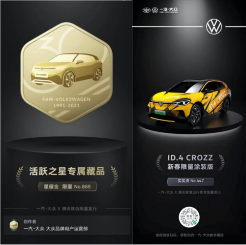 2022年伊始,数字藏品在汽车营销领域持续发声。一汽-大众则携手腾讯推出“一汽-大众2022年限量版数字藏品”,其中多样化的玩法解决了DTC模式下用户运营的难题,创新了数字藏品的营销价值。