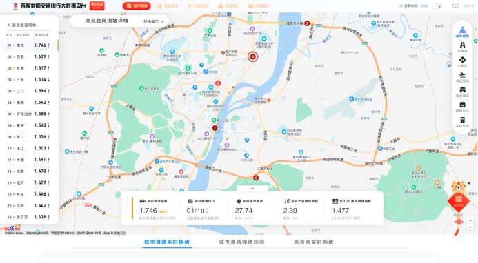 多地号召下,不少人选择了“就地过年”,在百度地图交通出行大数据平台的中国主要城市拥堵排行界面中,用户可查看全国城市拥堵指数实时排行,也可对比城市间拥堵情况差异;百度地图交通出行大数据平台的城市详情页中,还能查看任一城市的城市道路实时拥堵详情、城市道路拥堵预测、高速道路实时拥堵详情,帮助平台用户透视城市交通全景,为城内出行保驾护航。