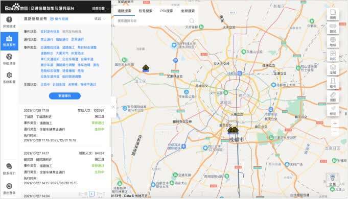百度地图交通信息发布平台(以下简称“信息发布平台”)为百度地图2022春运交通保障计划的三大平台之一。信息发布平台提供24小时交通事件精准发布服务,全国各地交警可第一时间通过该平台发布施工、封路、管制、事故、积水等交通事件信息,经平台信息系统处理后,会通过百度地图APP、全国各地路面智慧诱导屏、百度地图路况播报联盟成员电台等多个渠道分发,精准传递给社会公众。