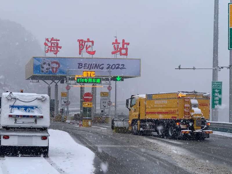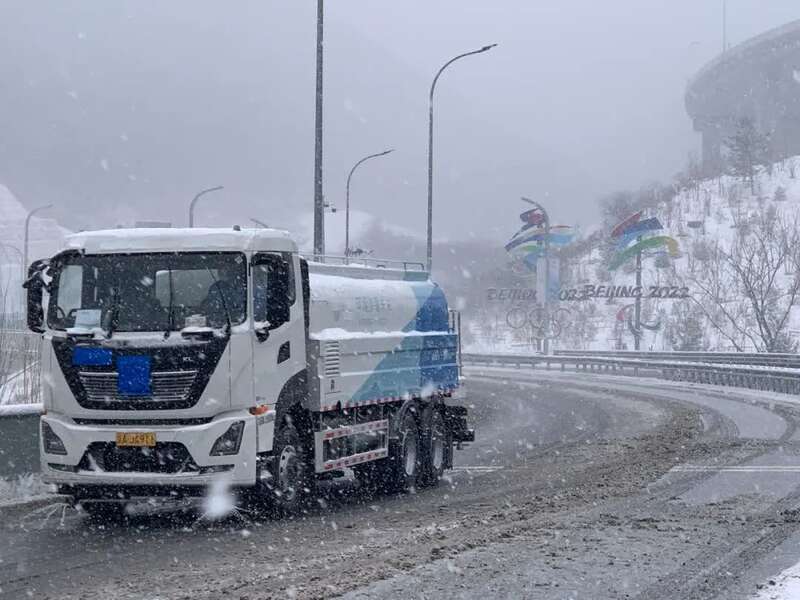 目前,北京环卫集团河北分公司崇礼项目部在太子城高铁站落客平台处清理积雪,保障冬奥会张家口赛区高铁站附近的道路畅通。同时,冬奥村附近的庆宁路五环标识处进行除雪组合作业。