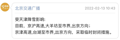 截至发稿前,因京津高速河北段封路,为防止社会车辆积压,保证社会群众安全,S15京津高速出京台湖至市界封闭。