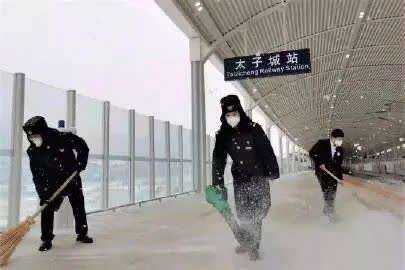 京津冀地区今日出现大范围降雪,张家口车务段太子城站闭环区域“雪之梦”服务组第一时间对站台积雪进行清扫,保障冬奥会期间人员出行安全、有序乘降。