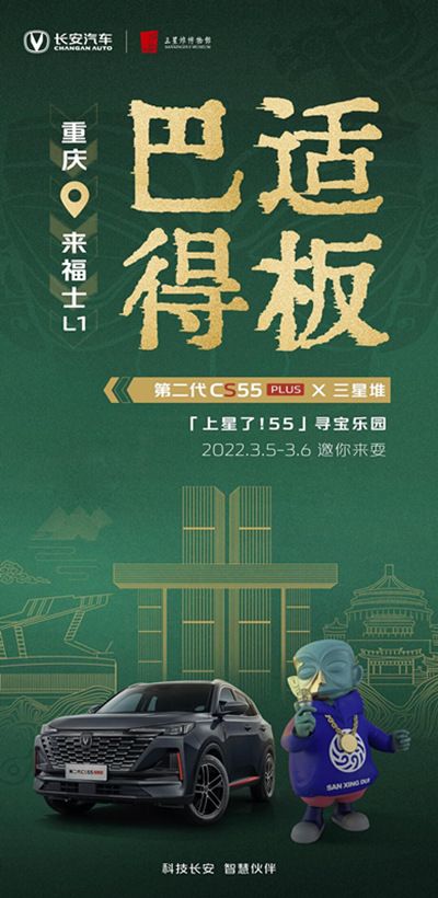 “20世纪人类最重大考古发现之一”的三星堆遗址从面世以来,便火遍全球,近日又有新动向!长安汽车联合三星堆推出「上星了!55」寻宝乐园七城快闪活动,当“新轻年智趣伙伴”第二代CS55PLUS遇上“沉睡三千年”的三星堆摇滚乐队将会碰撞出怎样的奇妙反应?3月5日-6日,第一站将来到重庆·来福士L1朝天门中厅,叫上你的新轻年伙伴一起打卡「上星了!55」寻宝乐园,体验不一样的热爱!