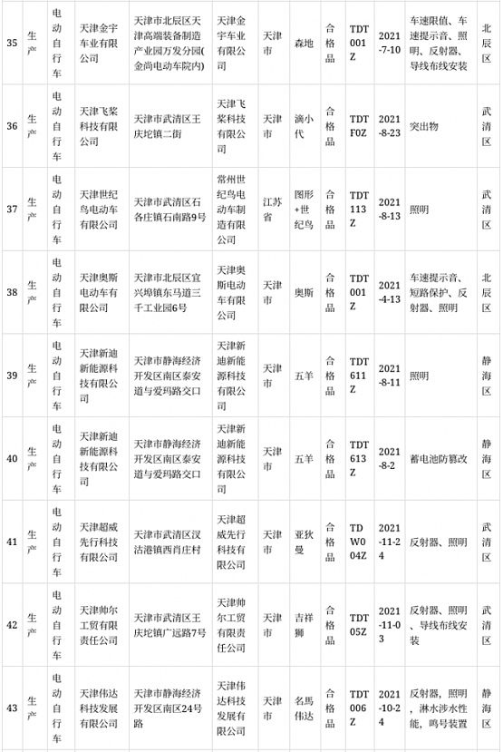 近日,天津市市场监督管理委员会通报2021年电动自行车及其相关产品质量监督抽查情况。“绿驹”、“宝岛BODO”、“大阳DAYANG”等标称商标电动自行车上不合格名单。