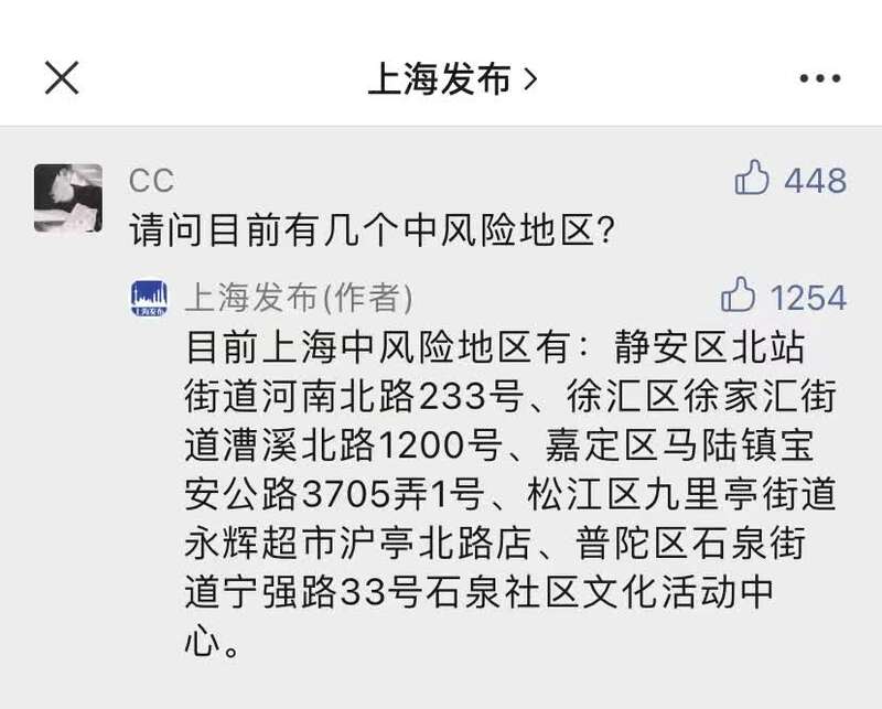 有网友在“上海发布”微信公众号评论区留言:目前上海有几个中风险地区?