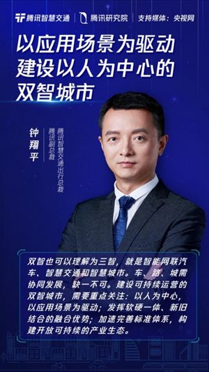大家好,我是腾讯钟翔平。今天研讨会的主题是“以应用场景为驱动,建设以人为中心的双智城市”,很荣幸能借这个机会与在座专家交流。下面由我来谈谈腾讯对“双智”建设的想法和实践。