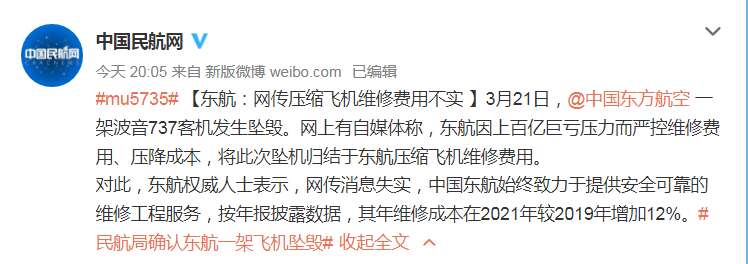 据中国民航网报道:对此,东航权威人士表示,网传消息失实,中国东航始终致力于提供安全可靠的维修工程服务,按年报披露数据,其年维修成本在2021年较2019年增加12%。