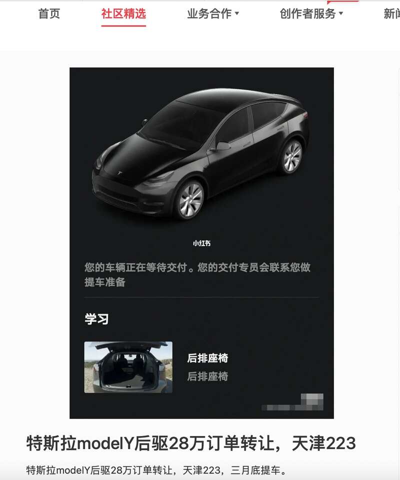 正在转让特斯拉订单的郝智(化名)对澎湃新闻表示,他所转让的Model Y后轮驱动版于2021年末下订单,订单价格为28.1万元,该车型现价31.69万元,差价高达3.6万元。
