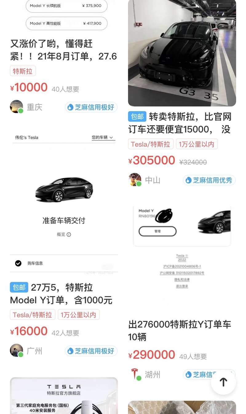 澎湃新闻记者注意到,在某交易平台上,有不少手握大量特斯拉Model 3和Model Y订单的卖家。与此同时,他们也在各大论坛和平台上发布求购信息,收购相关订单。收购价也根据提车周期、下单价格、选装情况等而不同。