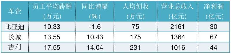 据统计,在比亚迪、长城、吉利三家头部自主品牌企业去年人均薪酬中,吉利员工平均薪酬最高,达17.55万元,其次是长城,为13.55万元,而比亚迪排在最后,人均薪酬仅10.33万元。