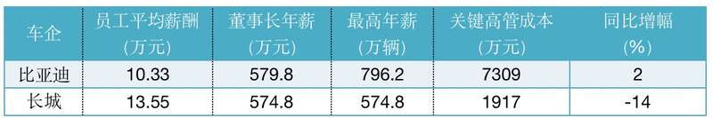 对于在A股市场上市的比亚迪和长城而言,年报中还包括了公司关键高管的年薪情况。据统计,比亚迪去年在关键高管人员薪酬支出方面高达7309万元,同比增长2%。而长城去年在此方面的支出为1917万元,同比减少14%。