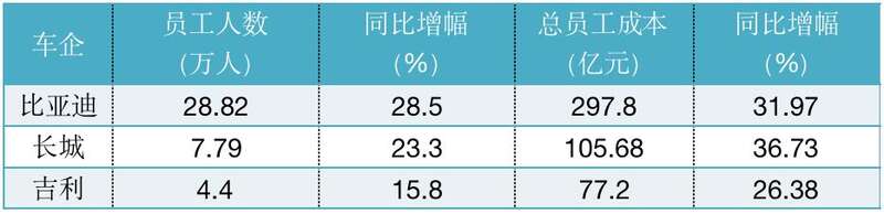 受员工扩编和平均薪酬提高的影响,三家车企去年的员工成本均出现了较大程度的增幅。其中,长城汽车同比增长36.73%排在首位。而因员工人数最多,比亚迪虽然人均薪酬最低,但是在员工成本上却是支出最高的,达297.8亿元。